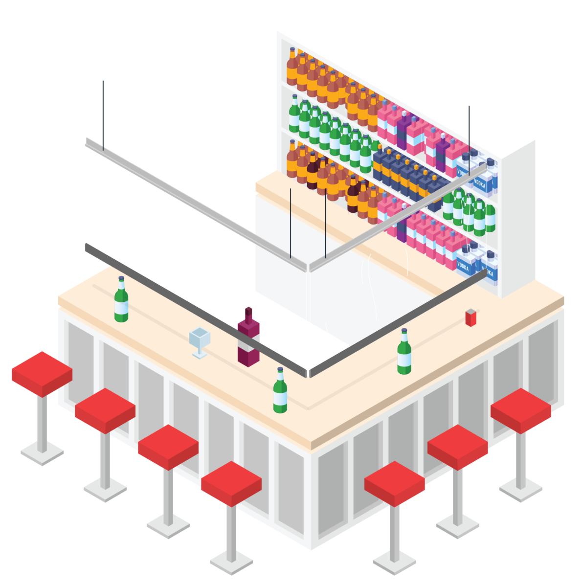 Easily install full-width hanging partitions to hang across the bar counter. This ensures the safety of customers and employees while serving.