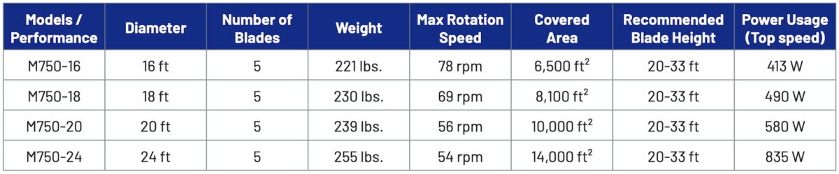 Our M750 model provides extreme value in large spaces and the energy savings will allow you a fast ROI. Managing to consume just 700 watts of energy at top speed, our M750 works best in ceiling heights between 23ft-50ft and go up to a diameter of 24ft.