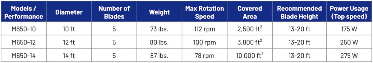 Our M650 fan is perfect for those medium spaces where the ceiling heights range from 9ft-23ft. The M650 is available in diameters of 10ft-14ft and consumes just 275 watts of energy at top speed.