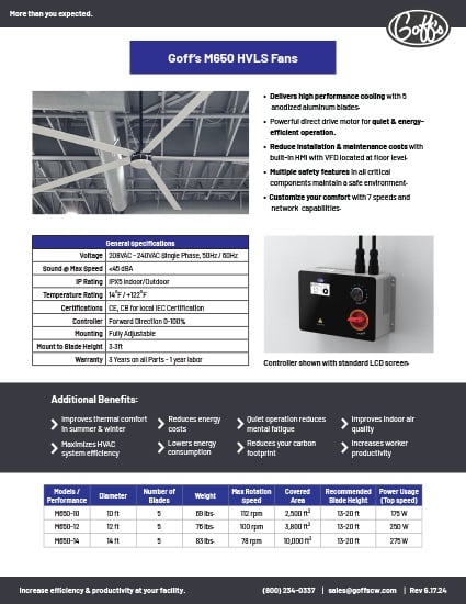 Goff’s HVLS Fans use their size to move air throughout large spaces to keep your entire facility comfortable, while saving on energy and costs. Our fans cost less to use than traditional fans and work better. Furthermore, HVLS fans give you so many other benefits, like improving temperature, reducing carbon footprint, quiet operation, improved air quality and happy workers!