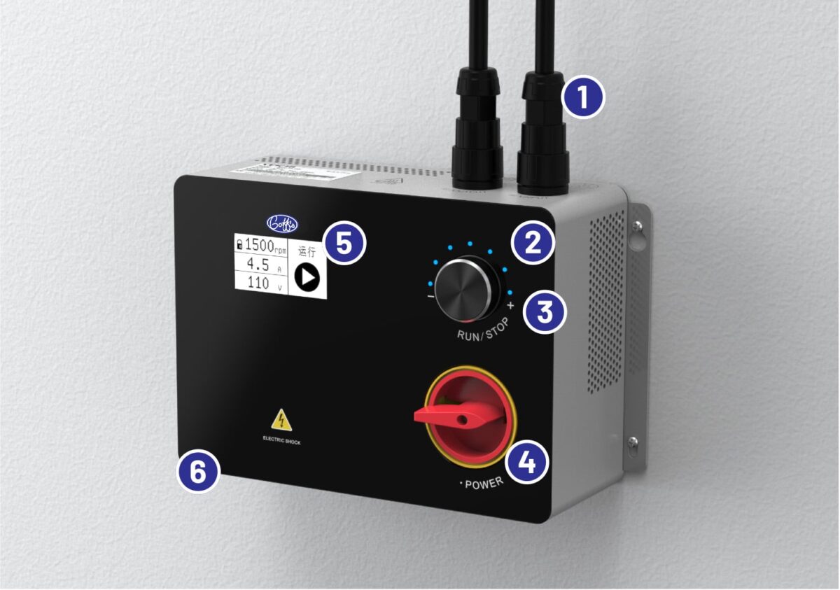 Our controller is mounted at ground level for easy access for service, installation and management of fan functions. Compatible with both the M650 and M750 HVLS Fans, our controller features: