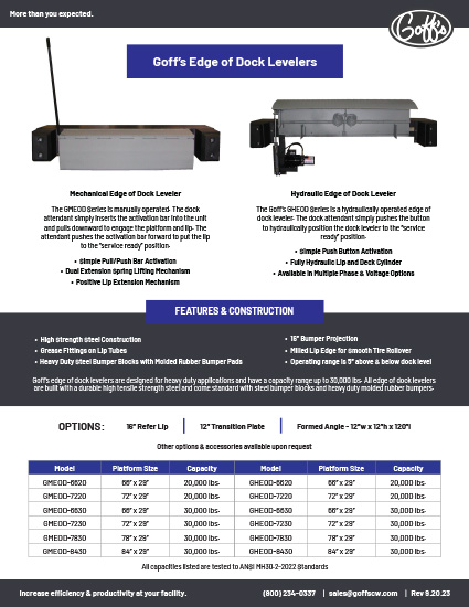 Goff’s Edge of Dock Levelers are designed for light to moderate capacities with a range up to 30,000 lbs. All EOD’s are built with a durable high tensile strength steel, steel bumper blocks with molded rubber bumpers, 16″ bumper projection and milled lip edge for smooth tire rollover.