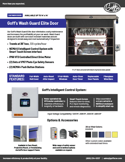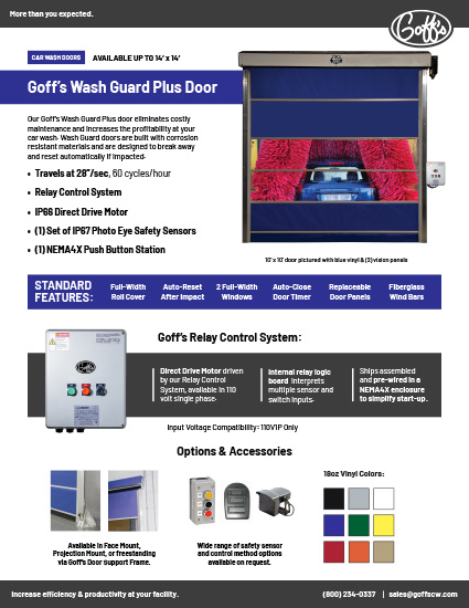 Our Wash Guard Elite door fully integrates with your operations and safety systems to provide a seamless experience. Combined with customizable panels & the Goff’s standard features package, it’s the perfect start-to-finish feature for your car wash experience.