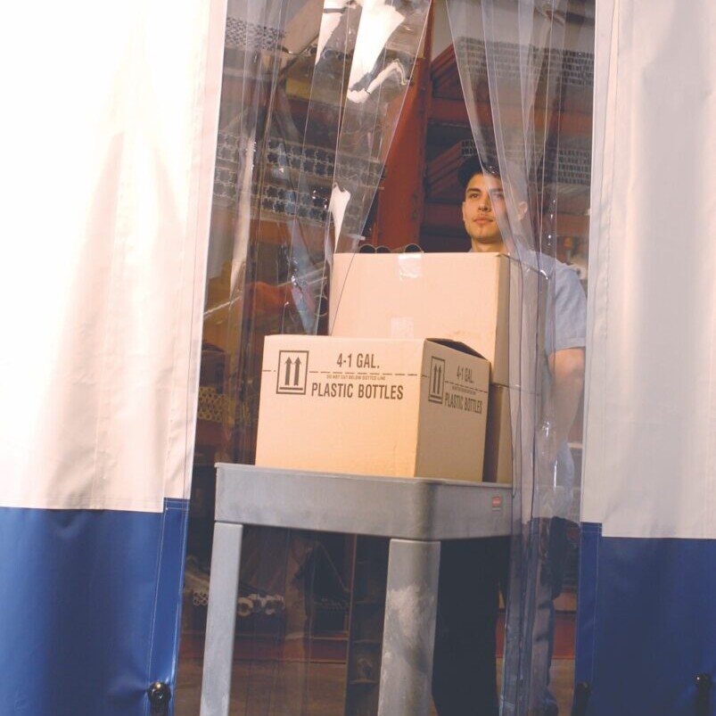 Add an easy pass-through strip door within your curtain wall while maintaining separation, available in various sizes.
